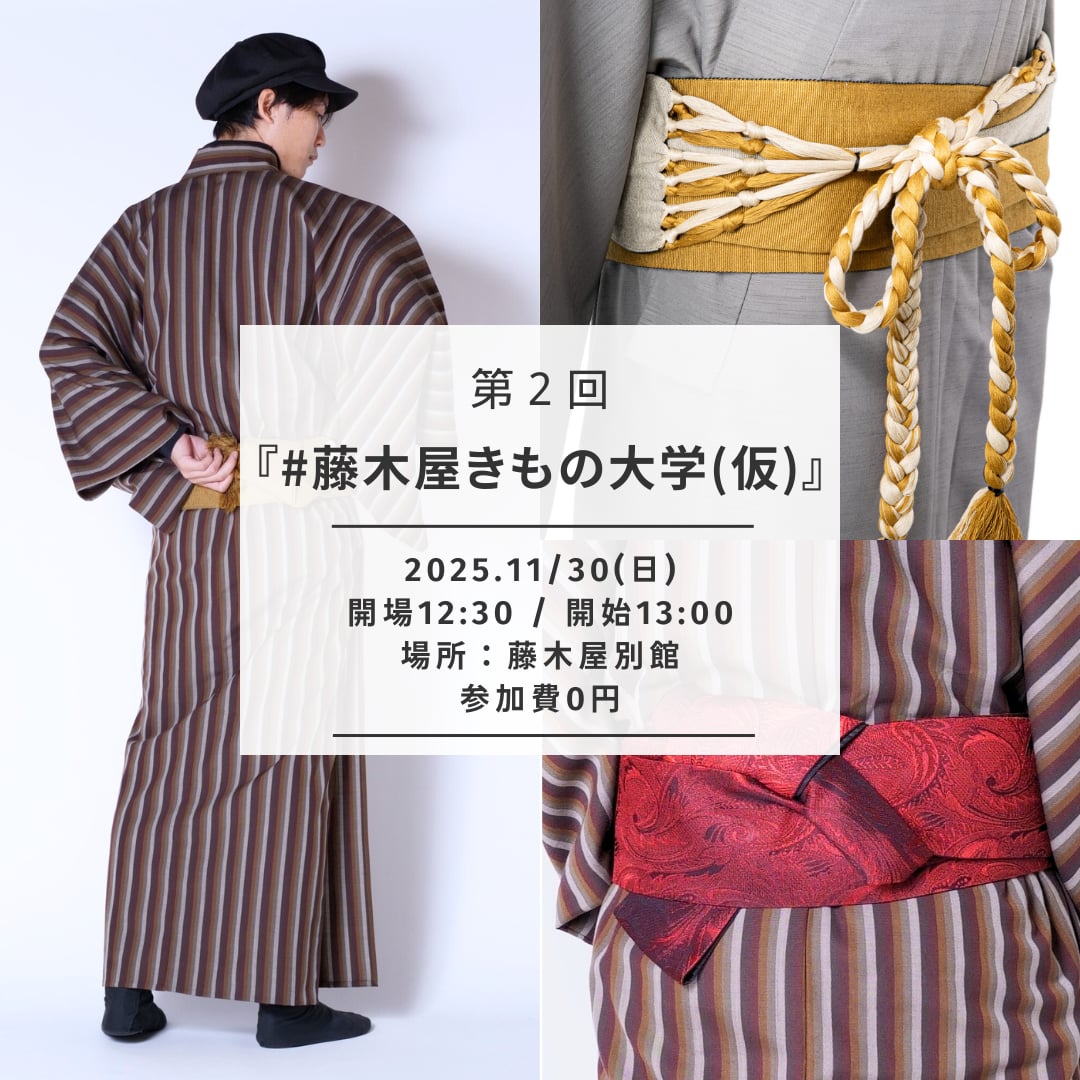📢開催決定‼️ 【第2回】『藤木屋きもの大学(仮)』 着物の着こなしや、 コーデのコツなどをお届けする本企画。 今回のテーマは「帯結び」❗️ 通常の角帯のほかにも 『紐付き角帯』「兵児帯」など メンズ着付けの帯結びについて、 文章や動画といったネット上だけでは なかなか伝わりきらないコツまで、 着物…